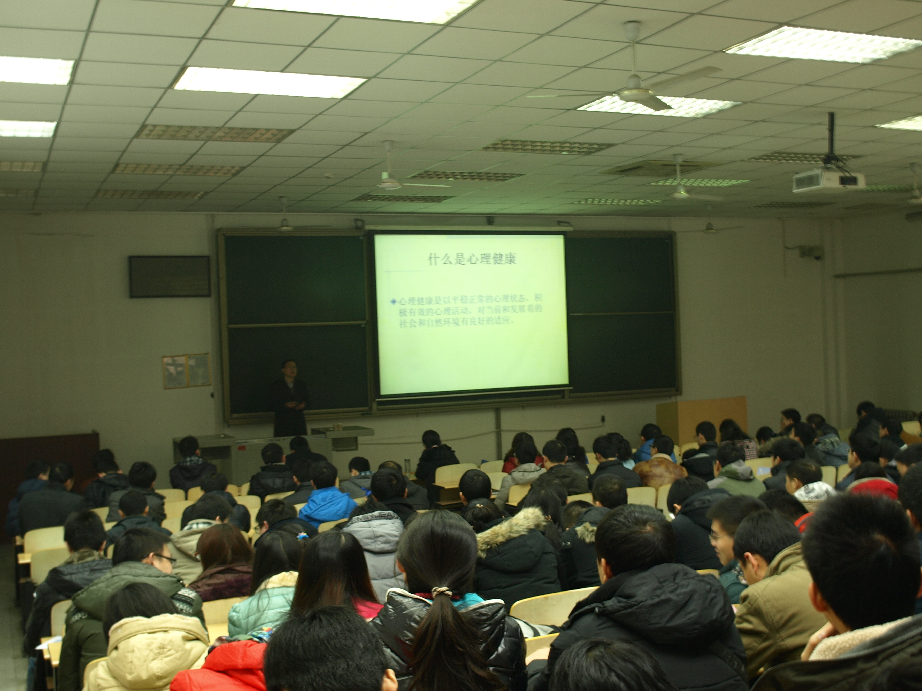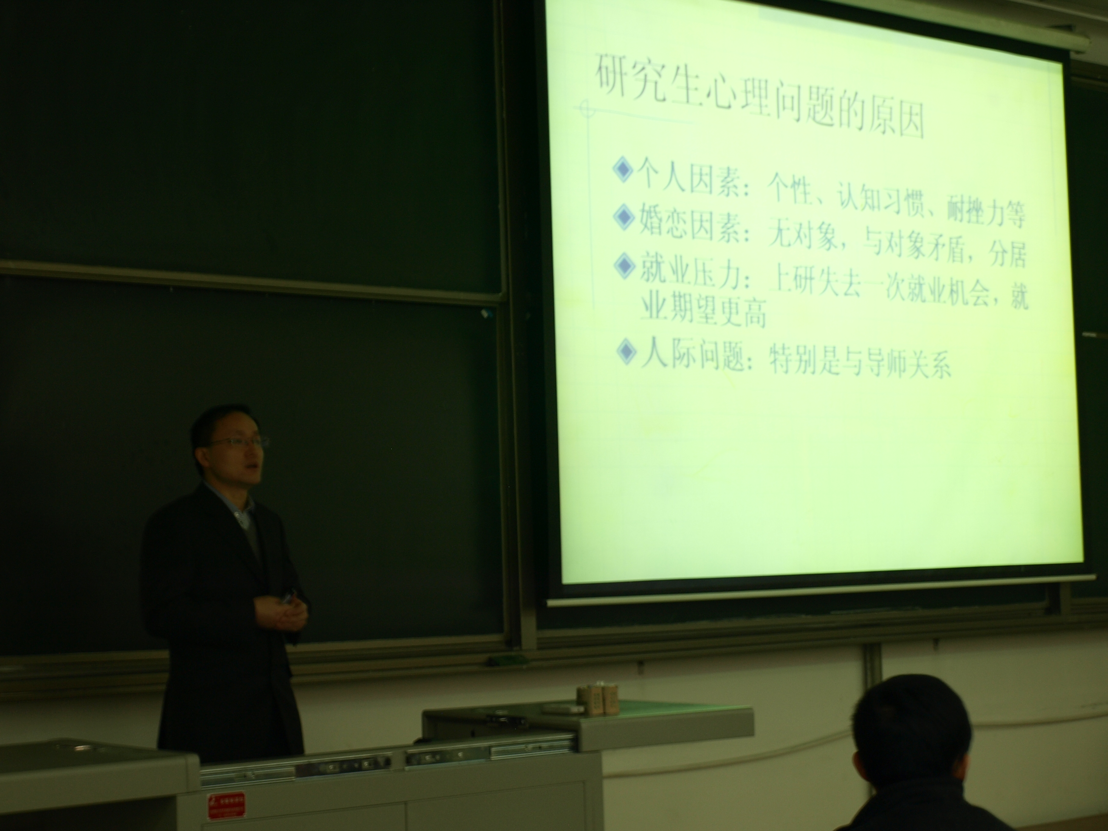 2013年12月25日-27日,机械学院特邀请西安交通大学大学生心理健康教育与咨询中心心理咨询师姚斌博士为全体博士生、硕士生开展了两期关于“研究生心理健康与自我调节”的主题讲座,院党委副书记杨鹏、辅导员雷励、何月、学院王昌老师出席了讲座。此次系列讲座深入浅出,从学生身边的生活实例出发,为广大研究生提供了专业的帮助和建议,现场反响热烈,得到广大学生的一致好评。
