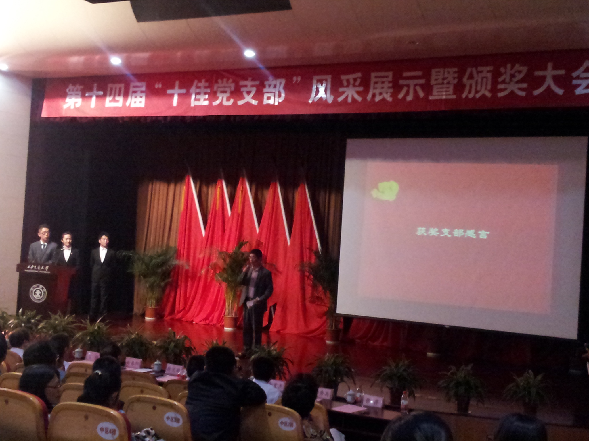 2013年5月31日下午,以“重内涵、比作风、信念成就中国梦”为主题的西安交通大学第十四届“十佳党支部及特色活动示范支部”风采展示暨颁奖大会在主楼多功能报告厅落下帷幕。按照学校第十四届“十佳党支部及特色活动示范支部”评选活动的安排,经学院选拔和学校初赛、复赛、决赛以及风采展示的三个月激烈角逐,机械学院博1116班党支部和硕2002班党支部在全校几百个研究生党支部中双双脱颖而出,成功入选,荣获本届西安交通大学“十佳党支部”称号。