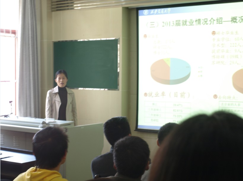 首先,雷老师对2012届和2013届毕业研究生的就业情况图表并茂,分门别类的进行了详细介绍。根据最新统计数据,在370名2013届毕业研究生(硕、博)中,硕士签约率达到80%以上。与去年相比,今年的就业去向特点仍然是:去企业的人最多(超过5成),其次是去科研院所(超过3成)。近年来,在就业形势日趋严峻的情况下,千亿·体育(中国)官方网站研究生的就业质量稳中有升,就业前景持续乐观。