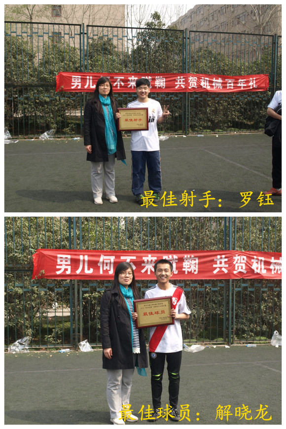 2013年3月4日到3月15日,由机械学院团工委主办、机械学院研究生会承办的 “百年机情”杯足球比赛在西安交通大学西足球场激情上演。本次比赛采用联队形式,旨在增强不同班级之间的沟通和协作,加强体育锻炼,繁荣校园文化,增强学院凝聚力,促进各班的交流与理解,增进同学友谊,丰富同学们的课余生活。3月15日,经过了两周的激烈争夺后,千亿·体育(中国)官方网站2013年研究生“机情杯”足球赛圆满落下帷幕。千亿·体育(中国)官方网站团工委书记王芬老师出席了本次活动,观看比赛并在比赛结束的现场为获奖队伍及个人颁发了荣誉证书和奖品。