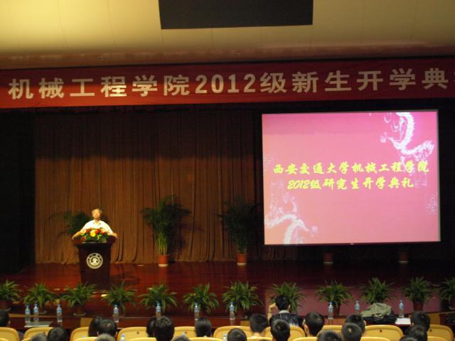 在2012级研究生的开学典礼上,邵金友老师主持并致欢迎辞,典礼在庄严的国歌声中拉开了序幕,机械学院党委书记梅雪松教授再次发表了讲话。梅教授希望同学们为了民族复兴、祖国强盛,提高思想觉悟,勉励同学们不但要培养能力和知识,更重要的是要培养责任、诚信和团队意识;接下来青年教师代表陈雪峰教授从研究生生活如何渡过、研究生如何开展研究及研究生生活如何更有意义三个方面阐述了如何做好研究工作,并祝愿同学们能够再创辉煌,陈教授精彩的讲话赢得了在场新生的阵阵掌声;研究生会主席张超作为老生代表发表讲话,他以“一个目标、两种热情和三个美好”来概括研究生的态度和责任;新生代表韩礼艳,从创新性和自主性表明了自己的决心,让交大辉煌激励自己;陈花玲教授作为老教师代表随后做了发言,主要讲述了正确的态度、如何做学问和几点建议三个方面,并以网上素材为讲稿,活跃了现场气氛,将全场气氛推向高潮;最后副院长李兵教授介绍了新生非常关心的学生生活和学生培养方面的问题,包括团队的介绍、培养方案的介绍和思想工作介绍等,并预祝同学们取得更好的成绩。