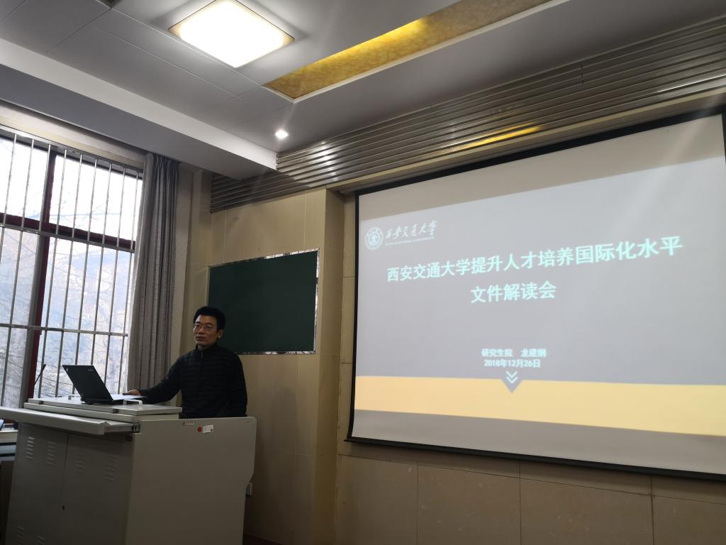 2018年12月29日下午四点,千亿·体育(中国)官方网站留学生专项会议在学院第三会议室顺利召开。会议主要讨论了有关留学生招生录取,留学生培养,英文专业课建设和留学生奖学金设置等话题,针对学校近期新出台的《西安交通大学提升人才培养国际化水平实施方案》以及相关文件进行了深入解读。学院国际交流主管副院长杨树明教授,国际教育学院副院长温广瑞教授,国际合作交流处副处长韦学勇教授,研究生院招生办副主任田小永教授,系所代表和教师代表等出席了会议。