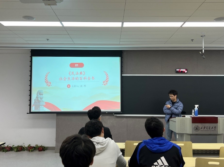 殷玮同志从涉及到我们衣食住行方方面面的《民法典》说起,分享了基本知识,并且结合同学们生活中的例子展示了《民法典》如何查看和使用,最终系统阐述其重大意义:满足法律法典化、体系化的需要;有利于完善市场经济的法治;有利于实现公正司法,依法行政;有效提升国家治理体系和治理能力的现代化。《民法典》能归纳整理零零碎碎可能互有矛盾的法律规定,对不合适不完善的单行法做一个补充,与时俱进地回应时代之问。