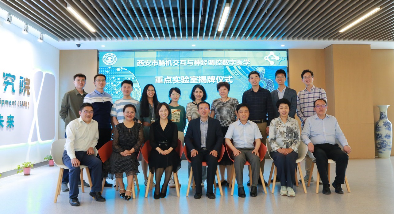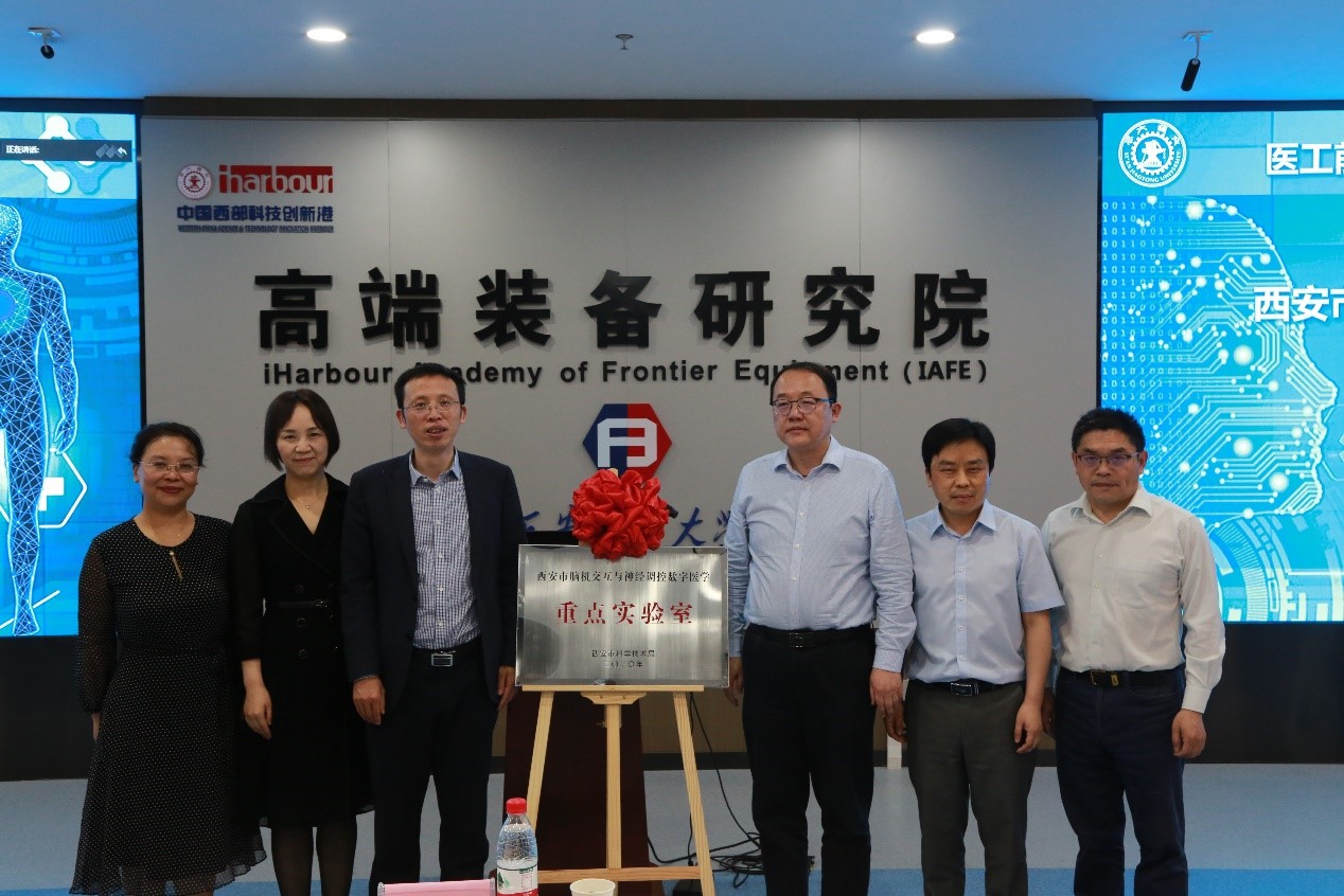 活动当天还举行了西安市脑机交互与神经调控数字医学重点实验室揭牌仪式。西安市脑机交互与神经调控数字医学重点实验室由西安交通大学、空军军医大学和西安市第一医院联合申请成立,揭牌仪式由医工交叉研究所党支部书记陶唐飞主持,高端装备研究院院长陈雪峰发表致辞,医工交叉研究所学术带头人、西安市脑机交互与神经调控数字医学重点实验室主任徐光华教授介绍实验室情况,空军军医大学西京医院康复科主任袁华、西安市第一医院神经内科主任吴松笛、西安市第一医院眼科医疗美容门诊部主任郅瑛同陈雪峰院长、徐光华教授、陶唐飞书记共同揭牌,陈雪峰院长为两家联合单位授牌。