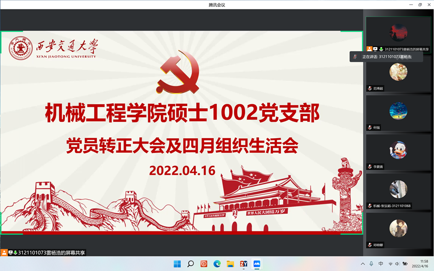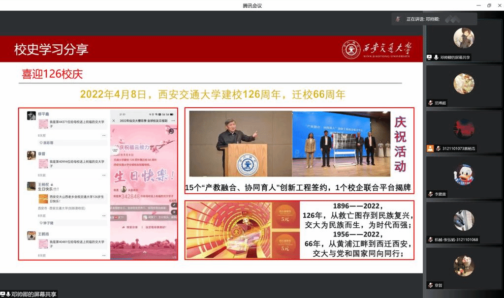 为庆祝西安交通大学126周岁生日、传承弘扬西迁精神、向同学们充分展现交大126年办学历程,本支部于2022年4月16日在线上举行了本月的组织生活会,组织支部同志学习交大历史,为母校庆生。