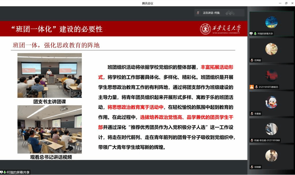 在“党建引领下的高校班团一体化建设”活动中,小组成员为同学们讲述了“班团一体化”建设的必要性,实践中“班团一体”存在的问题以及“班团一体化”制度的实践创新路径。指出:班级团支部作为高校共青团的“细胞”,是团开展各项工作的首要阵地,也是发挥共青团政治性、先进性和群众性最基层的团组织。班级中应该以团支部为领导核心,明确职责,建立班团一体干部队伍;规范实施,创新实施班团一体化职能;党建引领,充分发挥党员、党组织的积极作用。