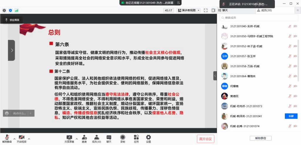 接下来由孙杰同志带领大家学习了网络安全法和西安交通大学学生违纪处分办法。疫情当前,作为交大青年亦是一名学生党员的我们更应该服从学校的管理,坚定政治立场,提高鉴别力,用我们的专业知识和素养来明辨是非曲直,不信谣,不传谣、自觉抵制谣言,勇于揭露虚假信息,努力建设良好的网络舆论生态环境。同时还要积极引导身边的亲朋好友正确对待虚假负面信息,坚信在党的领导,我们定能取得这场疫情攻坚战的胜利。