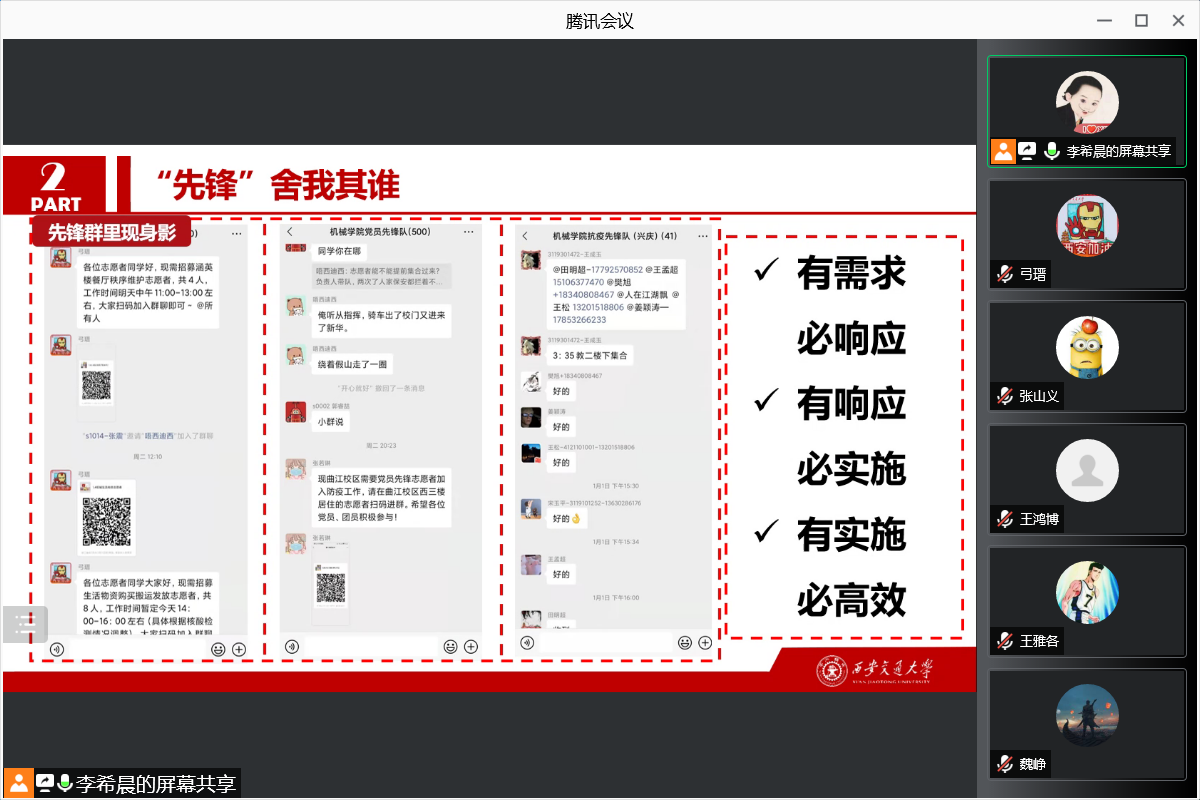 面对突如其来的疫情,在学校学院落实相关政策和网格化管理制度后。硕0003党支部也积极响应号召,多位同志投身党员先锋队伍。弓瑨同志担任创新港校区机械学院党员先锋队学生负责人,李希晨、刘蒙蒙同志分别担任教学二区、兴庆校区纵向网格负责人,殷玮、武天林等同志积极报名并参加志愿活动,此外其他同志也通过线上线下的形式助力疫情防控!大家始终牢记党员身份,戴党徽亮身份,有需求必响应、有响应必实施、有实施必高效。李希晨同志随后强调作为党员同志应注意我们的言论导向,与其被动地抱怨,不如主动地改变,我们有责任带领周围同学积极发声,传递正能量!