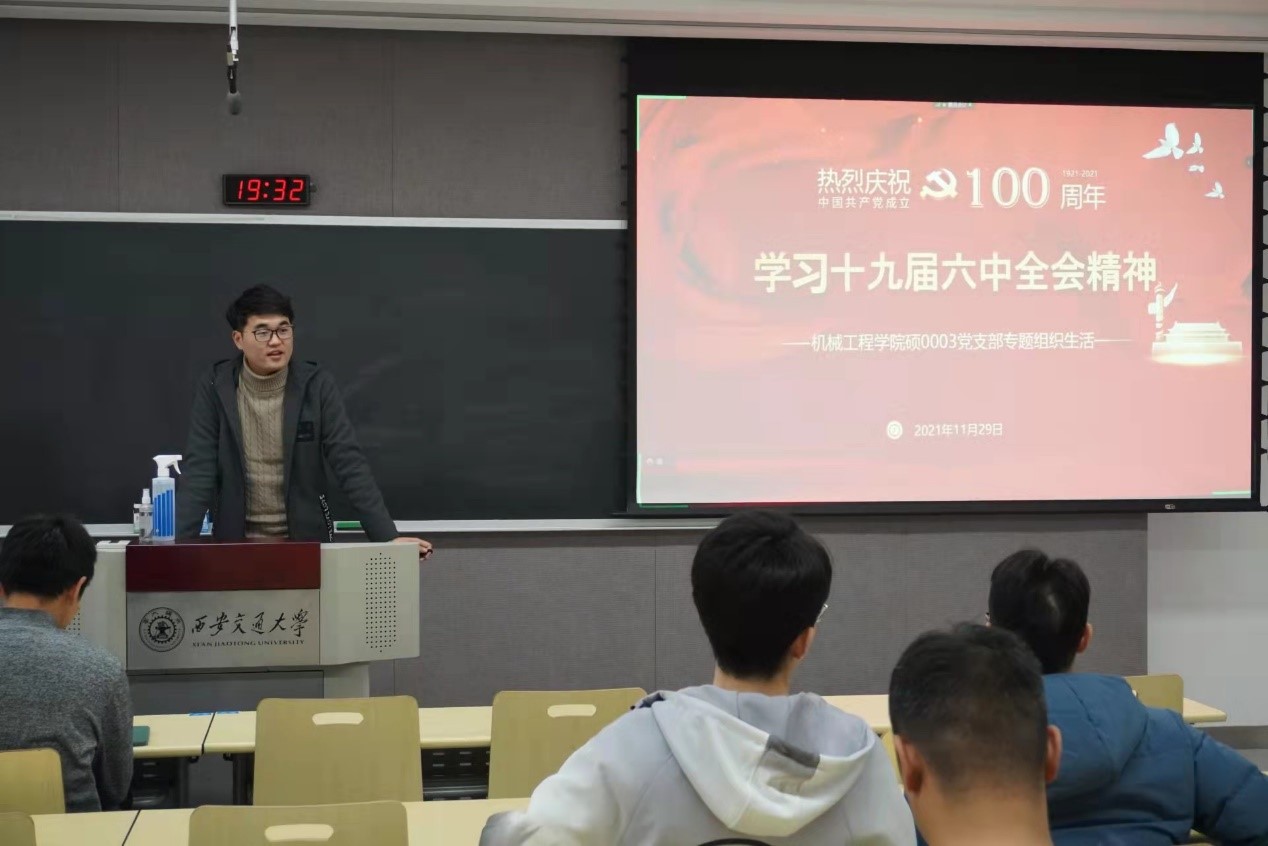 11月29日西安交通大学千亿·体育(中国)官方网站硕0003党支部举办了“十九届六中全会精神解读“专题组织生活会,支部全体党员,部分积极分子及发展对象参加学习,一同分享党的百年奋斗重大成就,学习党的百年奋斗历史经验。