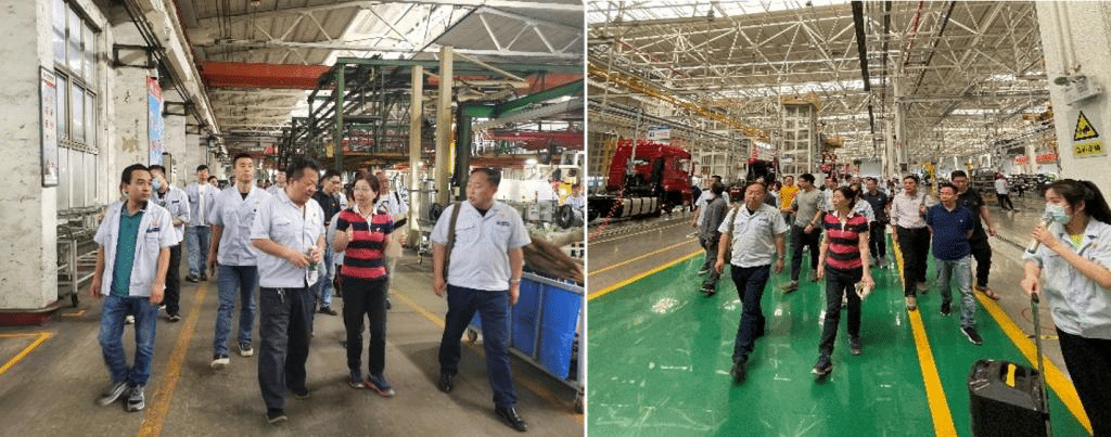 随后全体人员来到了桥一厂,参观了代表先进制造的机器人自动生产线,并参观了桥装配一厂、车架厂等仍在使用中的其他老厂区,了解军、民用车车桥、车架等零部件生产现状。最后,在陕汽商用车总装车间参观了陕汽重、轻型商用车和新能源汽车的总装产线。