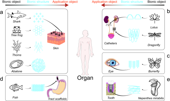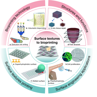 近年来,3D打印技术在生物制造领域取得了显著进展,推动了包括组织工程、再生医学、药物输送以及个性化医疗设备在内的多个生物医学应用的快速发展。这些进步使得科学家们能够精确地制造出与自然界功能类似的复杂结构,从而更好地满足医学和工程的需求。西安交通大学千亿·体育(中国)官方网站与美国普渡大学西拉法叶分校的研究团队上发表了一项创新性研究,展示了如何通过3D打印技术制备具备多功能特性的生物结构,为组织工程及再生医学的应用开辟了新的可能。利用增材制造技术,设计并制造出具有仿生特性的生物结构,这些结构模仿了自然界中各种功能性生物材料,例如表面超疏水性、各向异性和机械强化等功能,进而用于植入器官和生物医学设备的制备。通过仿生表面和界面结构的优化设计,3D打印技术为植入体进一步提升了与人体的相容性及生物力学性能。